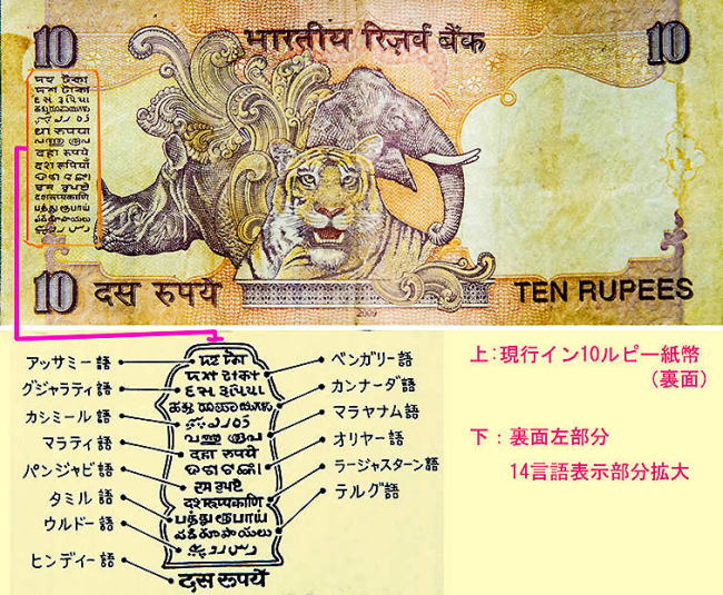 ネットで拾った画像ですが、インドの現行紙幣の裏側には多種類の言語が表記されているそうです。その解説は「河童の覗いたインド」から引用されています。南部のドラヴィダ系のタミル語、テルグ語や北部のチベット系まで恐ろしく多様な言語にあふれている13億の国。独立時にヒンドゥー教徒とイスラム教徒を大別してパキスタンと分国しているが、まだ多くのイスラム教徒も1億8000万(ムスリムの人口規模ではインドネシア、パキスタンに次ぐ規模)が居住している。私たちがインド人でイメージするターバンを巻くシク教徒も存在する。